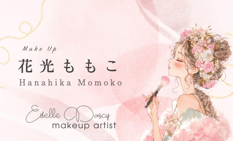 【花光ももこ】 目的 フリーのメイクアップアーティストとしてお客様に認知していただくこと。 ターゲット 撮影や舞台に出演するモデルや芸能人、結婚式や成人式などの人生の節目を迎える人々など。 デザイン概要 フリーのメイクアップアーティストとして、顧客のボリューム層である女性に親しみを持ってもらえるよう、ピンクを基調とし女性的な可愛らしいイメージを意識して制作しました。