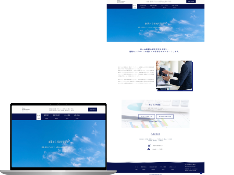 全体的に深い青色をベースに、ビジネスシーンの画像も使用し、ビジネスマンにとって頼りがいのある会計事務所であるというアピールができるよう制作しました。