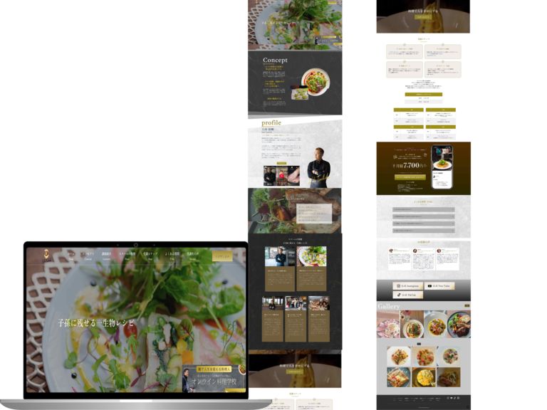 「子孫に残せる一生物レシピ」というキャッチフレーズを中心に、講師のプロフィールや講義内容の詳細、受講した生徒の感想など分かりやすく制作しました。