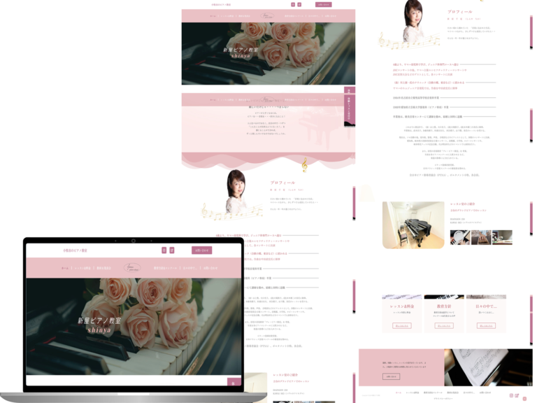 【小牧市のピアノ教室 様】 目的 ピアノ教室の生徒を増やしたい。 ターゲット ピアノを習いたいと思っている小中学生とその保護者。 デザイン概要 ピアノの先生が女性ということもあり、生徒に寄り添う教室であることをアピールするよう制作しました。ページ内にはレッスンや料金の詳細、教育方針など詳細に記載しています。