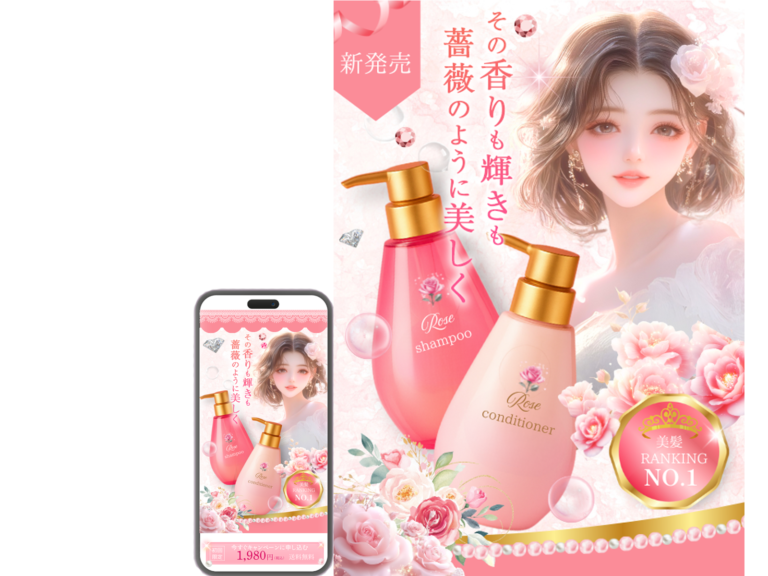 【その香りも輝きも 薔薇のように美しく】 目的 新発売のシャンプーとコンディショナーの宣伝。 ターゲット 20代~40代の、新作ヘアケア商品をお得に試したい女性。 デザイン概要 シャンプーとコンディショナーの容器がピンクで、薔薇をモチーフにしているということで、ページ全体から細部に至るまでピンクの薔薇の画像を使用し、髪も心も華やぐ女性のイメージで制作しました。