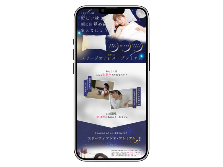 【スリープオアシス・プレミアム】 目的 質の良い睡眠ができる枕の紹介。 ターゲット 熟睡できない、目覚めが悪いなど睡眠に関して悩みがある人。 デザイン概要 ぐっすりと眠れる静かな夜をイメージしてデザインしました。夜をイメージさせる背景と、枕の白がコントラストになっていて見やすくなるよう制作しました。