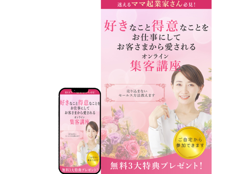 ママ起業家がターゲット層ということで、ピンク色や花の画像など、全体的に優しい雰囲気で制作しました。