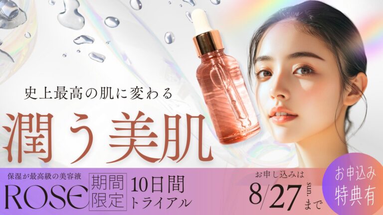 【史上最高の肌に変わる 潤う美肌】 目的 美容液の期間限定10日間トライアルの宣伝。 ターゲット 自分に合った美容液を探している人。無料で新しく質の高い美容液を試してみたい人。 デザイン概要 「10日間」やお申込期限など、見る人にとって必要な情報はなるべく大きな文字で書いています。美容液の実物、肌が綺麗な女性、そして潤いをイメージさせる背景の水滴などで美容液の高級感が伝わるように制作しました。